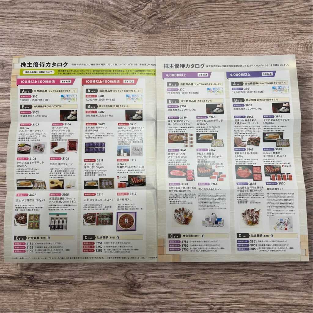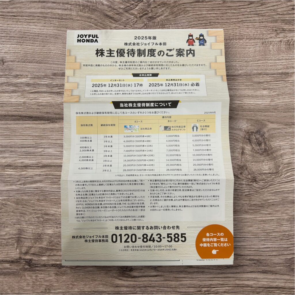 ジョイフル本田では、グループ店舗で利用できる**株主優待券(買物割引券)**がもらえます。